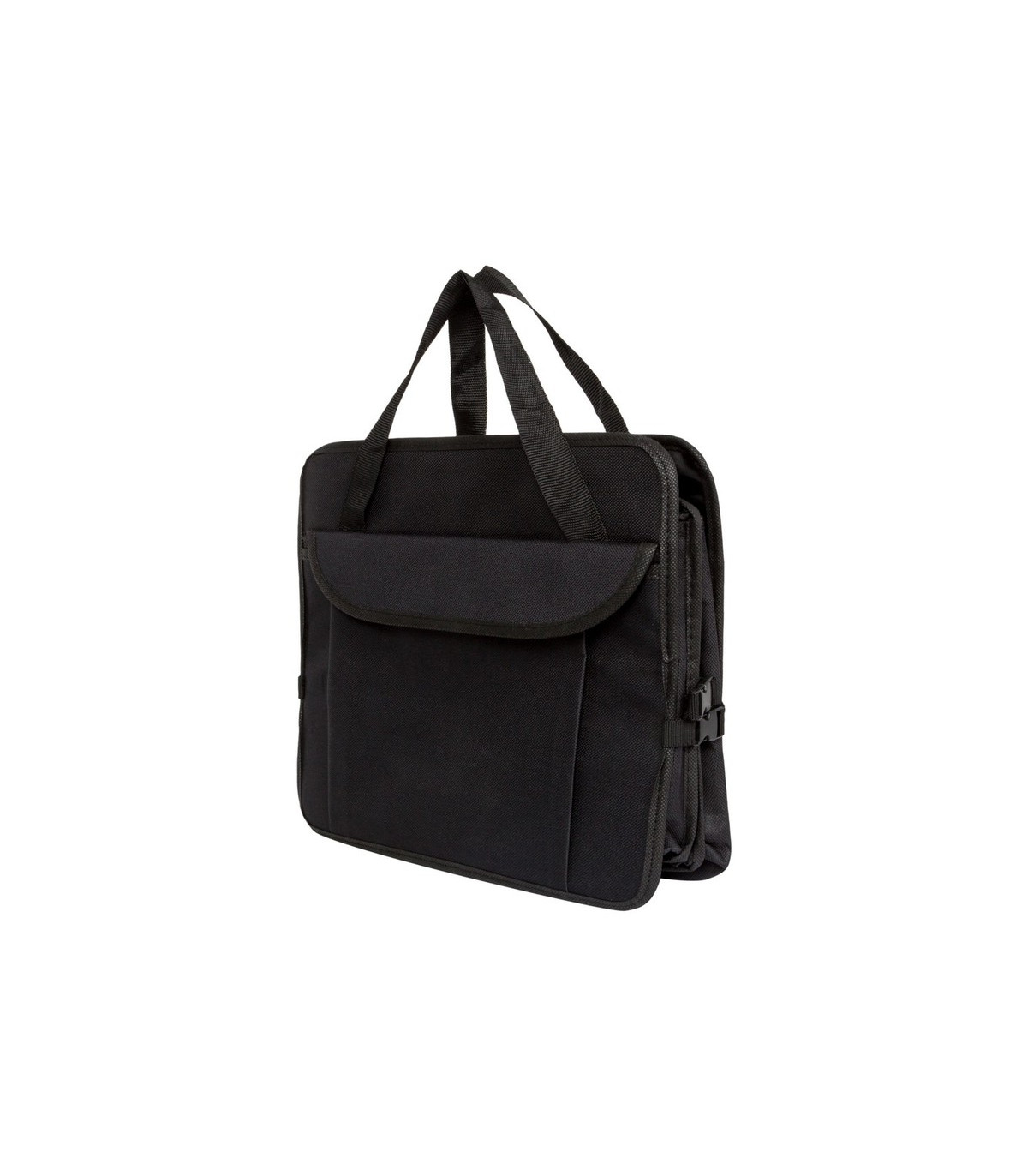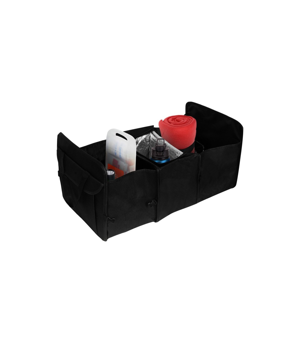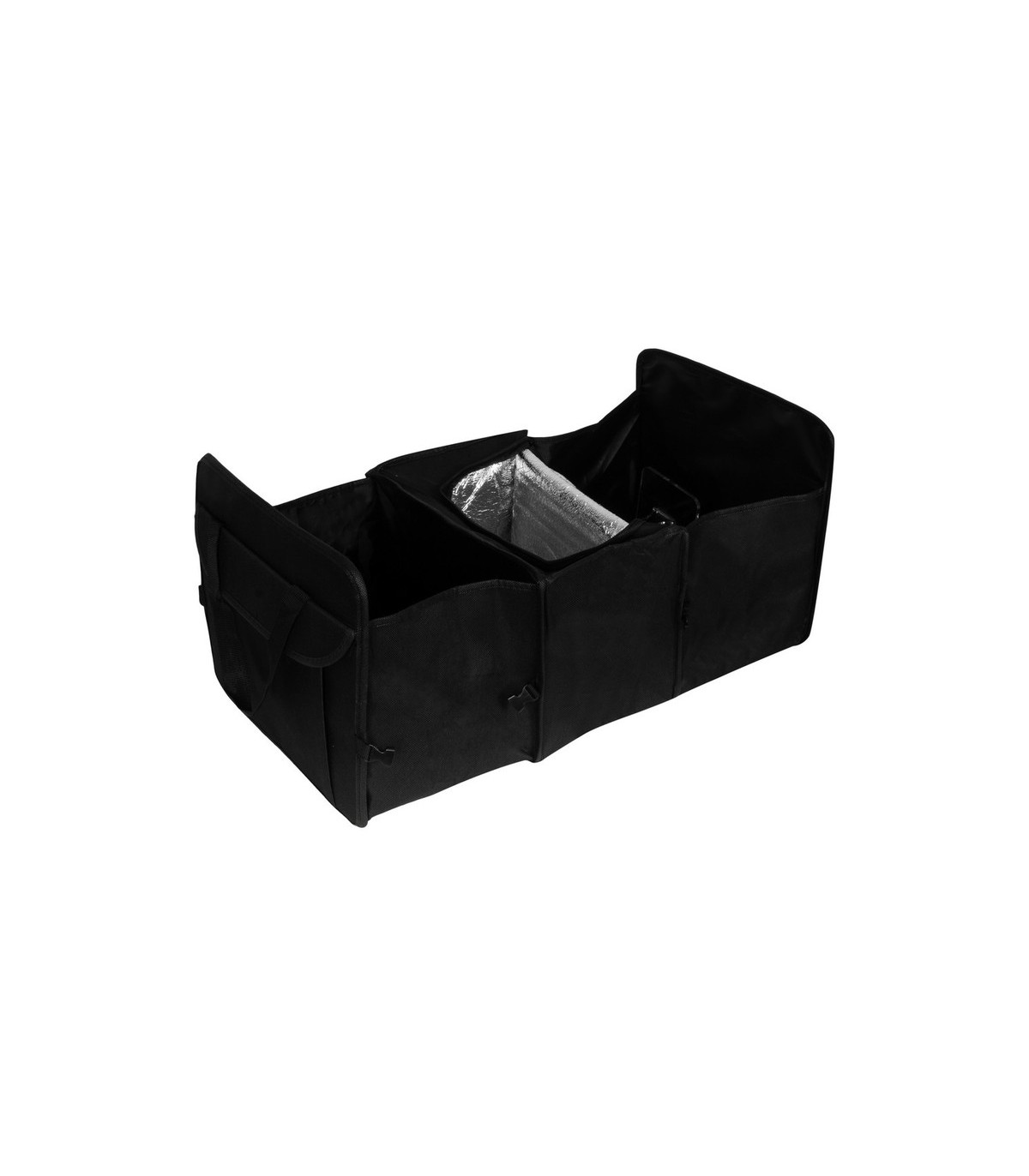 Foldable car organizer with 2 large compartments, a zippered thermal insulation compartment, 2 Velcro side pockets and 2 Velcro bottom pockets