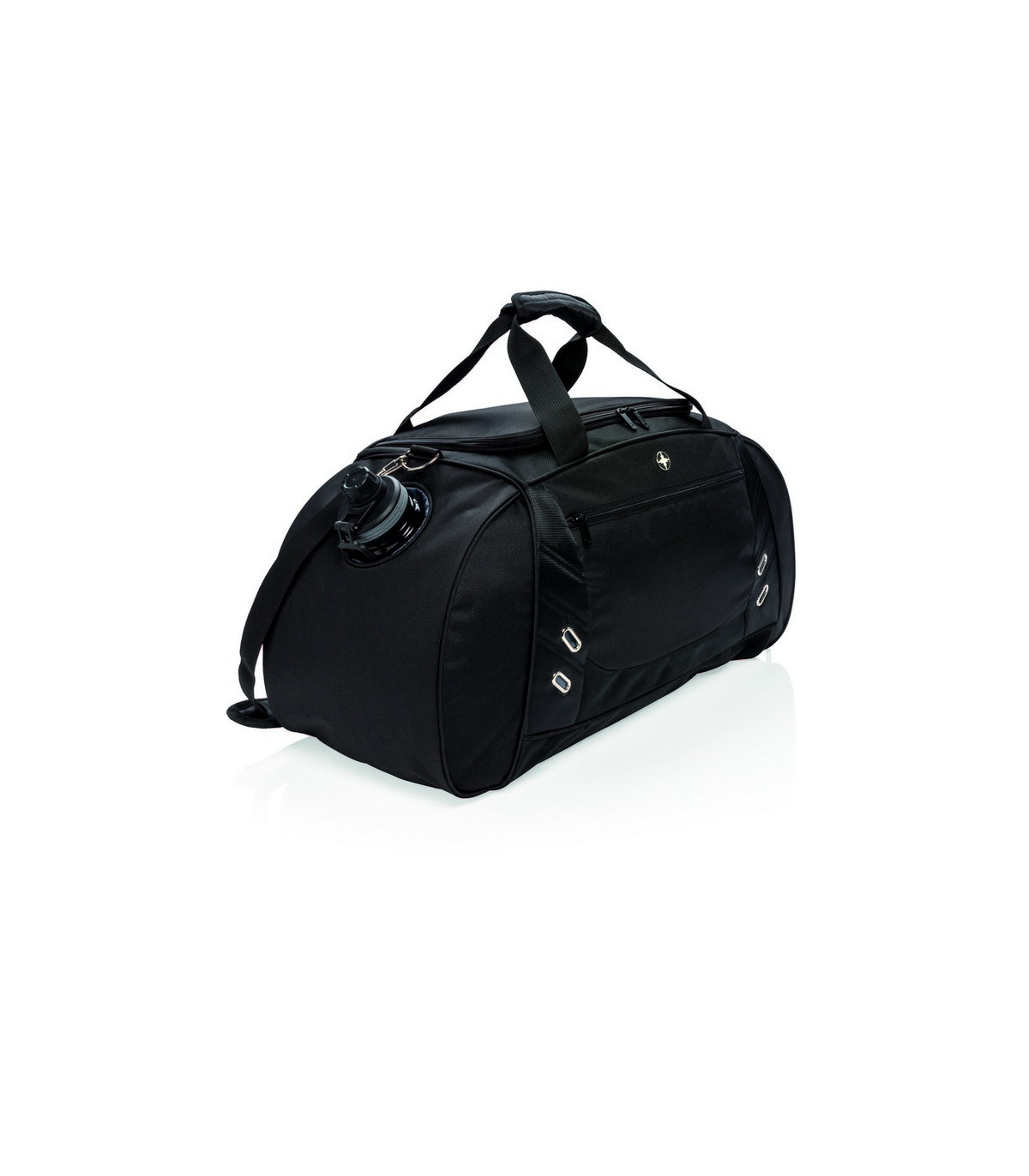 Includes a roomy main compartment with a U-shaped top zipper closure, a side entry shoe compartment with air vent and a side bottle holder compartment.