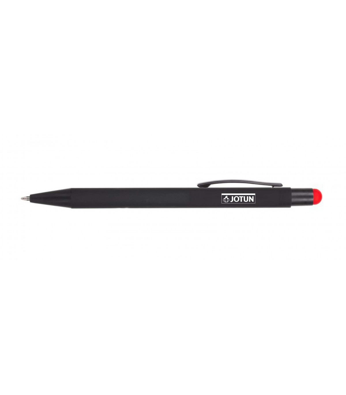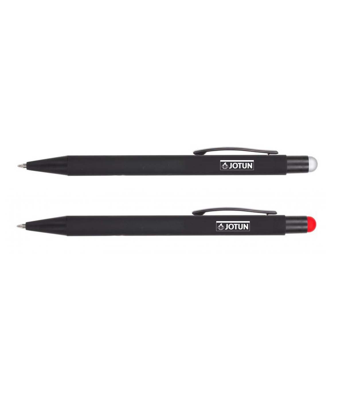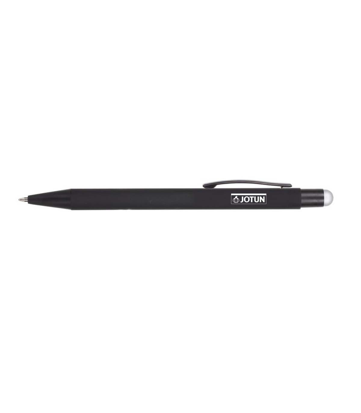 Długopis, touch pen, czarny gumowany trzon, grawer ukazuje srebrną błyszczącą powierzchnię.