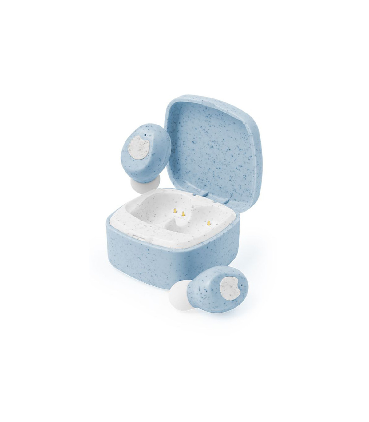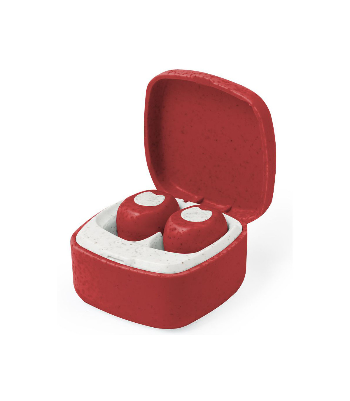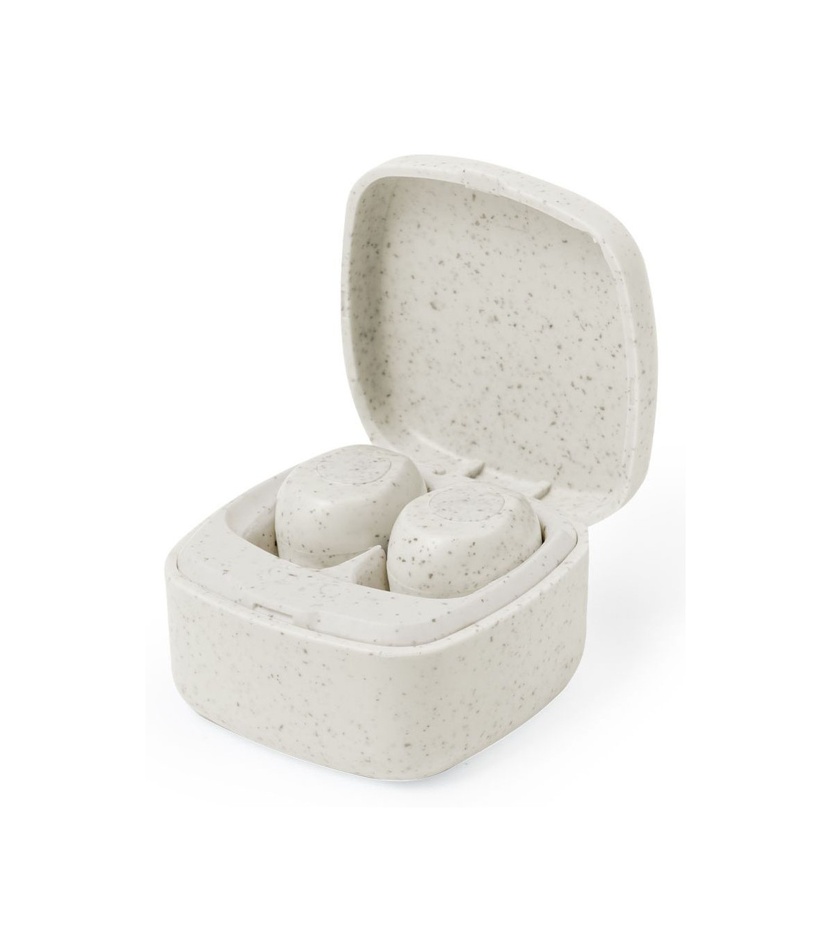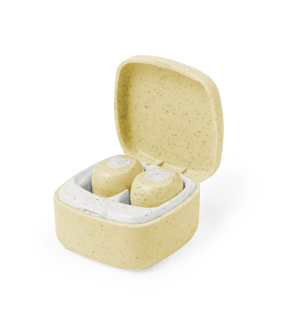 Słuchawki wykonane ze słomy pszenicznej, z łączem Bluetooth® 5.0. Ergonomiczna konstrukcja, w tym przycisk sterowania dotykowego zintegrowany ze słuchawką, każda z baterią o pojemności 30 mAh. Dopasowana baza ładująca z baterią o pojemności 200 mAh i diodą LED wskazującą stan ładowania. Zestaw głośnomówiący i ładowalny, z kablem typu C w zestawie. Pakowane pojedynczo w luksusowe etui z zawiasami. Dostępne w szerokiej gamie kolorów, łączących naturalny kolor słomy pszenicznej z oryginalnymi odcieniami.