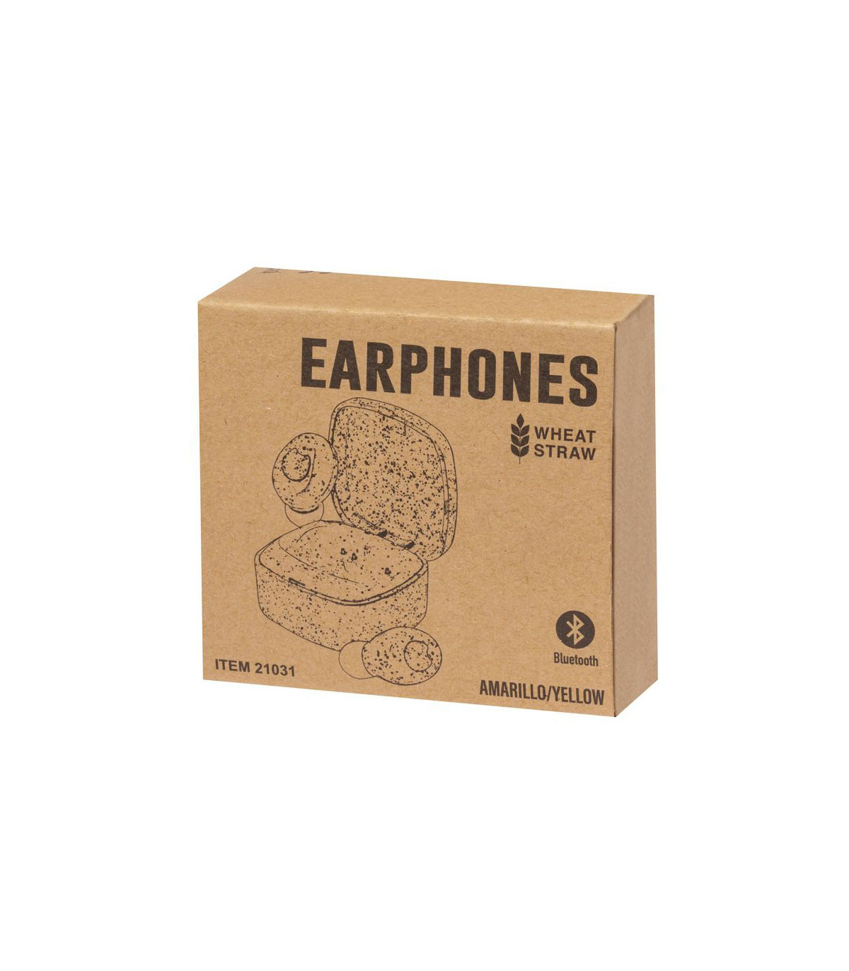 Słuchawki wykonane ze słomy pszenicznej, z łączem Bluetooth® 5.0. Ergonomiczna konstrukcja, w tym przycisk sterowania dotykowego zintegrowany ze słuchawką, każda z baterią o pojemności 30 mAh. Dopasowana baza ładująca z baterią o pojemności 200 mAh i diodą LED wskazującą stan ładowania. Zestaw głośnomówiący i ładowalny, z kablem typu C w zestawie. Pakowane pojedynczo w luksusowe etui z zawiasami. Dostępne w szerokiej gamie kolorów, łączących naturalny kolor słomy pszenicznej z oryginalnymi odcieniami. W zestawie instrukcja obsługi w języku angielskim i hiszpańskim.