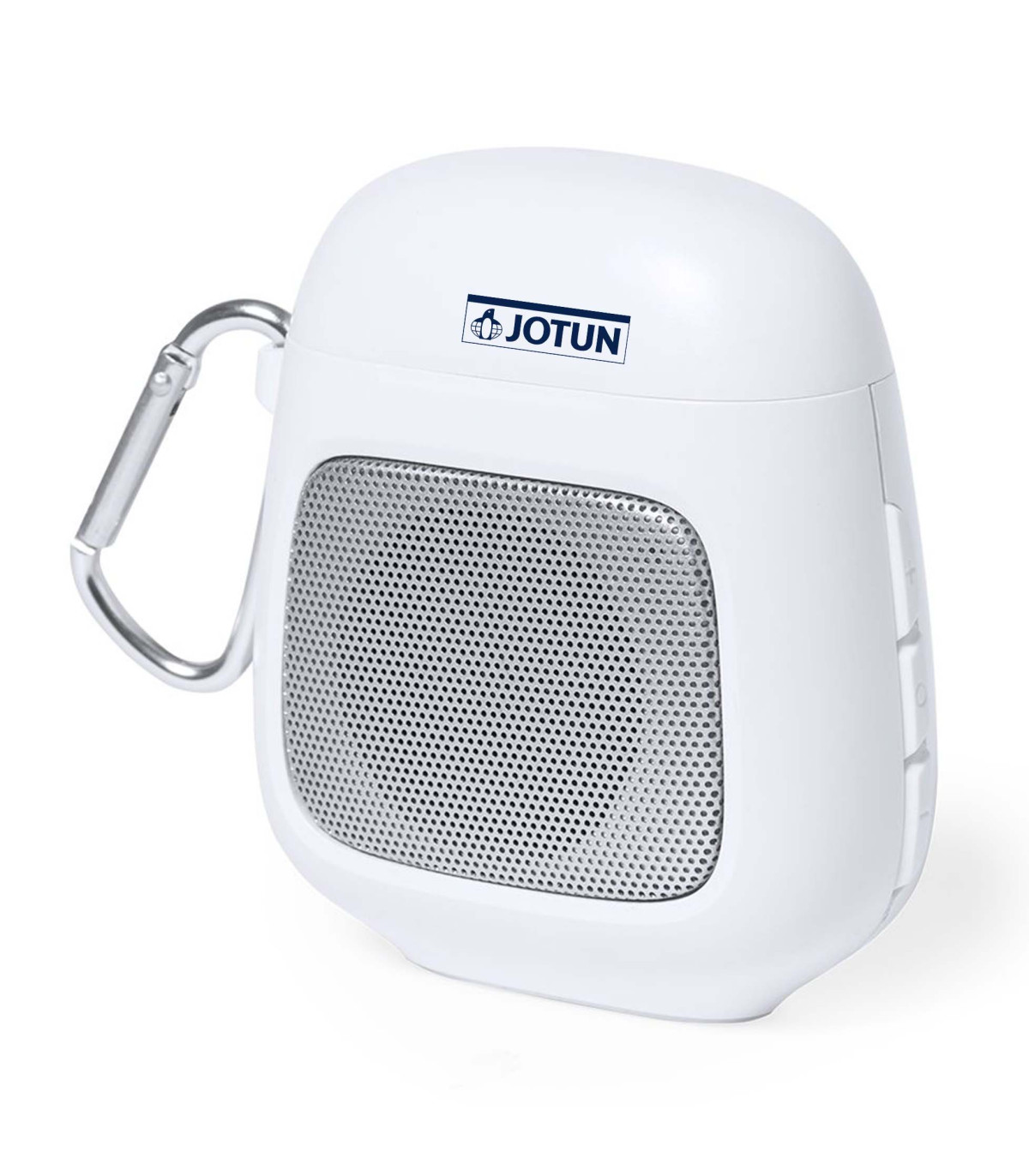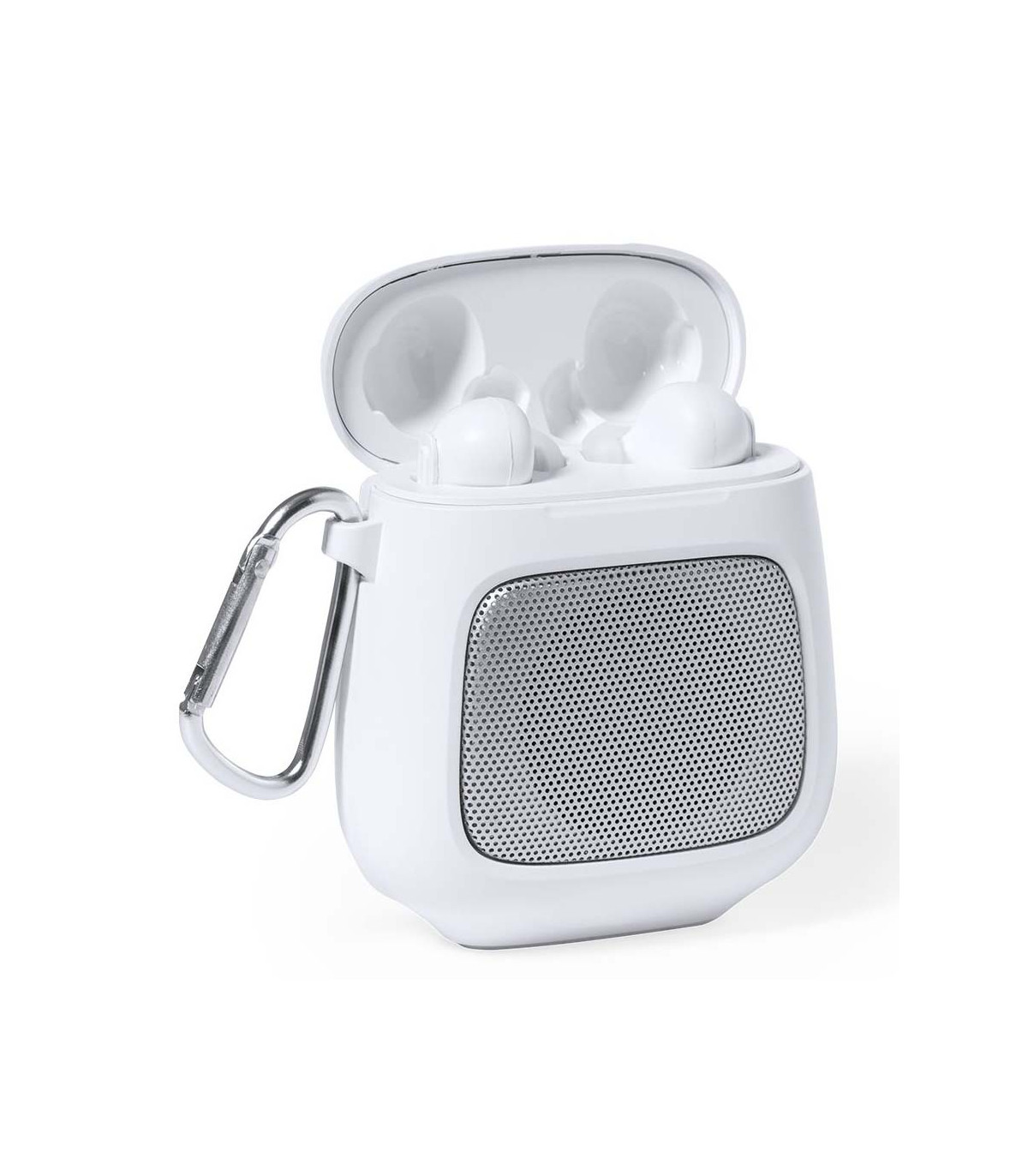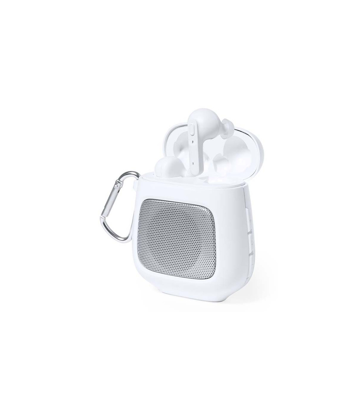 Unikalne słuchawki z głośnikiem i łączem Bluetooth® 5.0, wykonane z wytrzymałego tworzywa ABS w kolorze białym. Zestaw zawiera głośnik Bluetooth® o mocy 3 W, funkcję głośnomówiącą i karabińczyk. Uzupełnieniem zestawu jest para słuchawek z wbudowanym przyciskiem sterującym i baterią o pojemności 30 mAh każda. Stacja ładująca o pojemności 600 mAh, z diodą LED wskazującą stan ładowania.