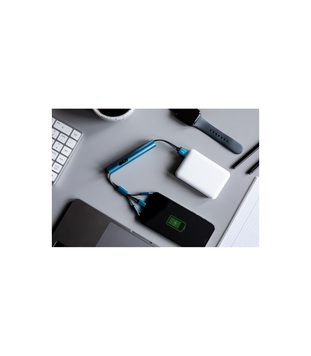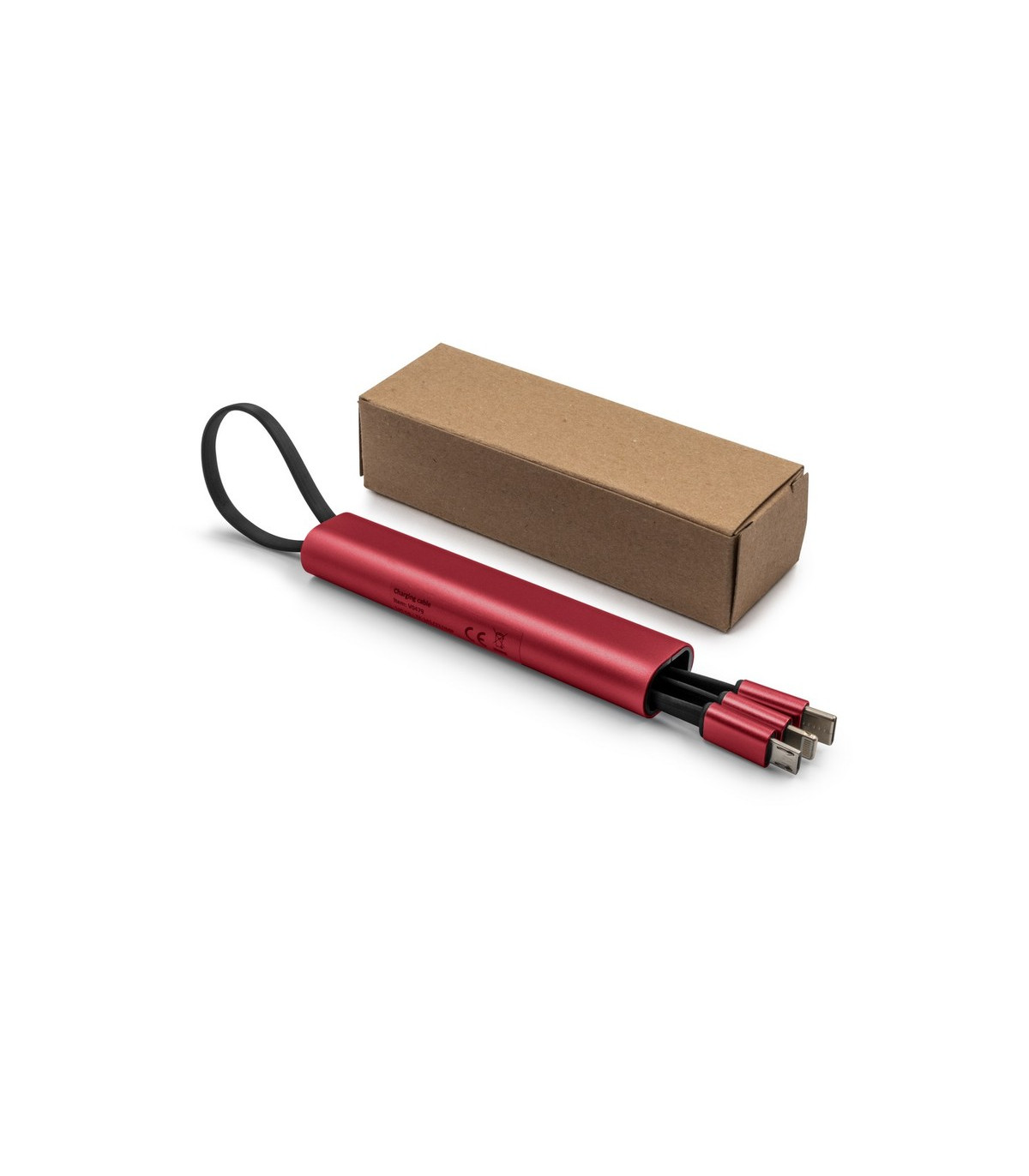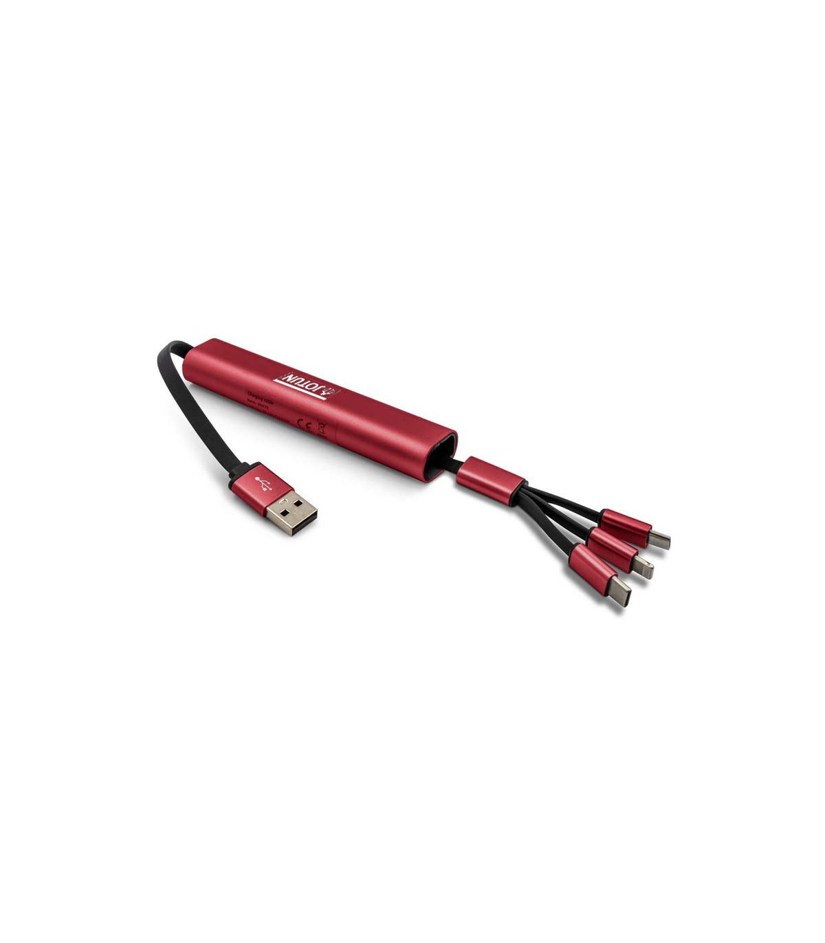 Kabel do ładowania z 4 końcówkami: USB, micro USB, USB typu C oraz końcówką kompatybilną z urządzeniami iOS, końcówka USB typu C z funkcją transferu danych, duża powierzchnia znakowania.