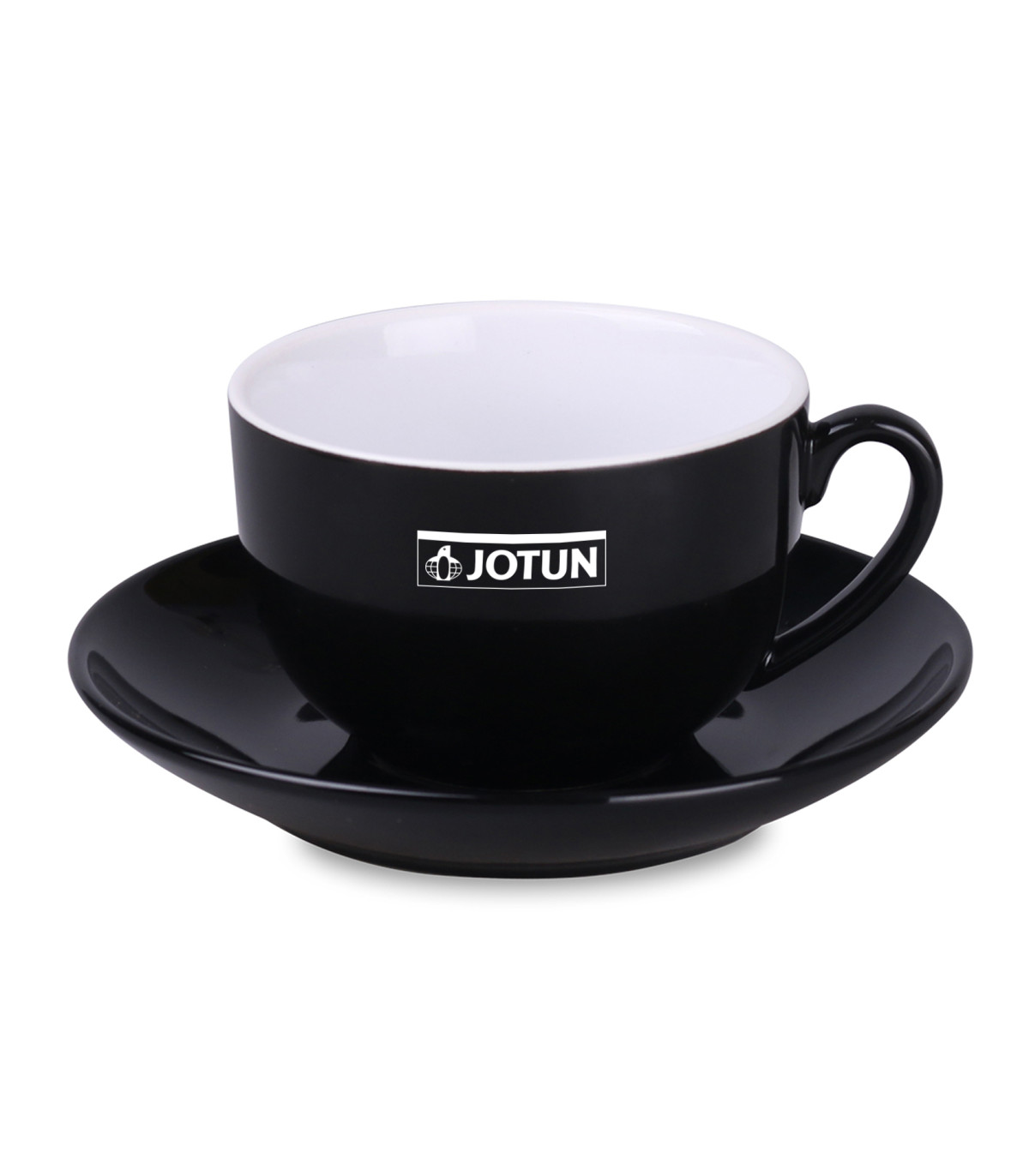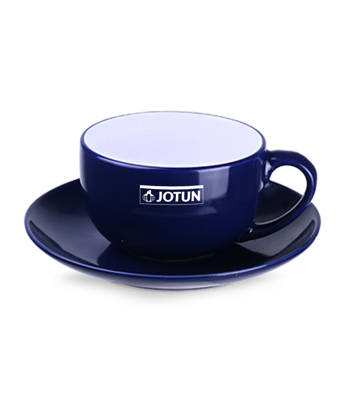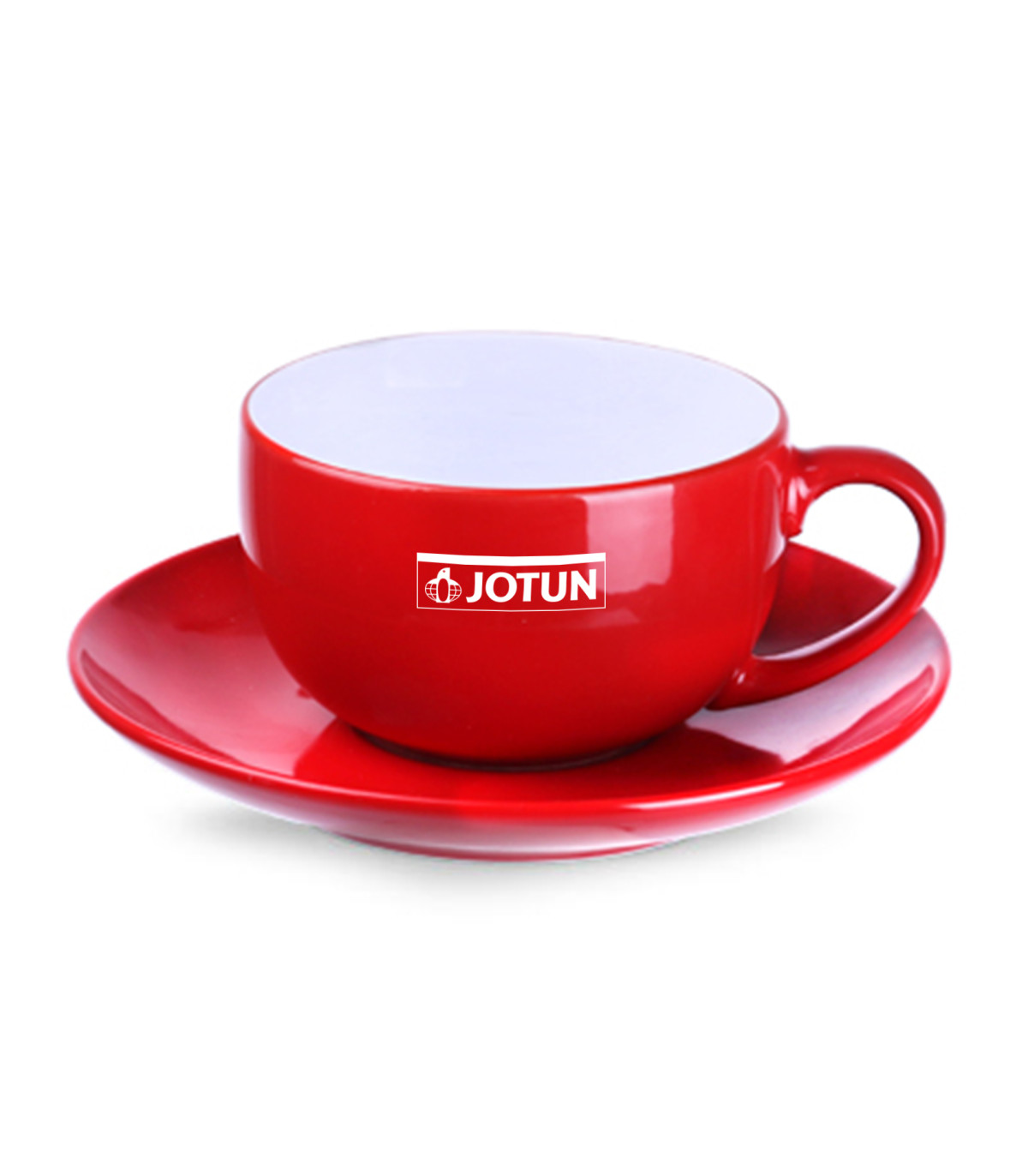 Obła filiżanka reklamowa z kolorowym szkliwem na zewnątrz i białym wnętrzem. Fason dostępny w wielu wersjach kolorystycznych.