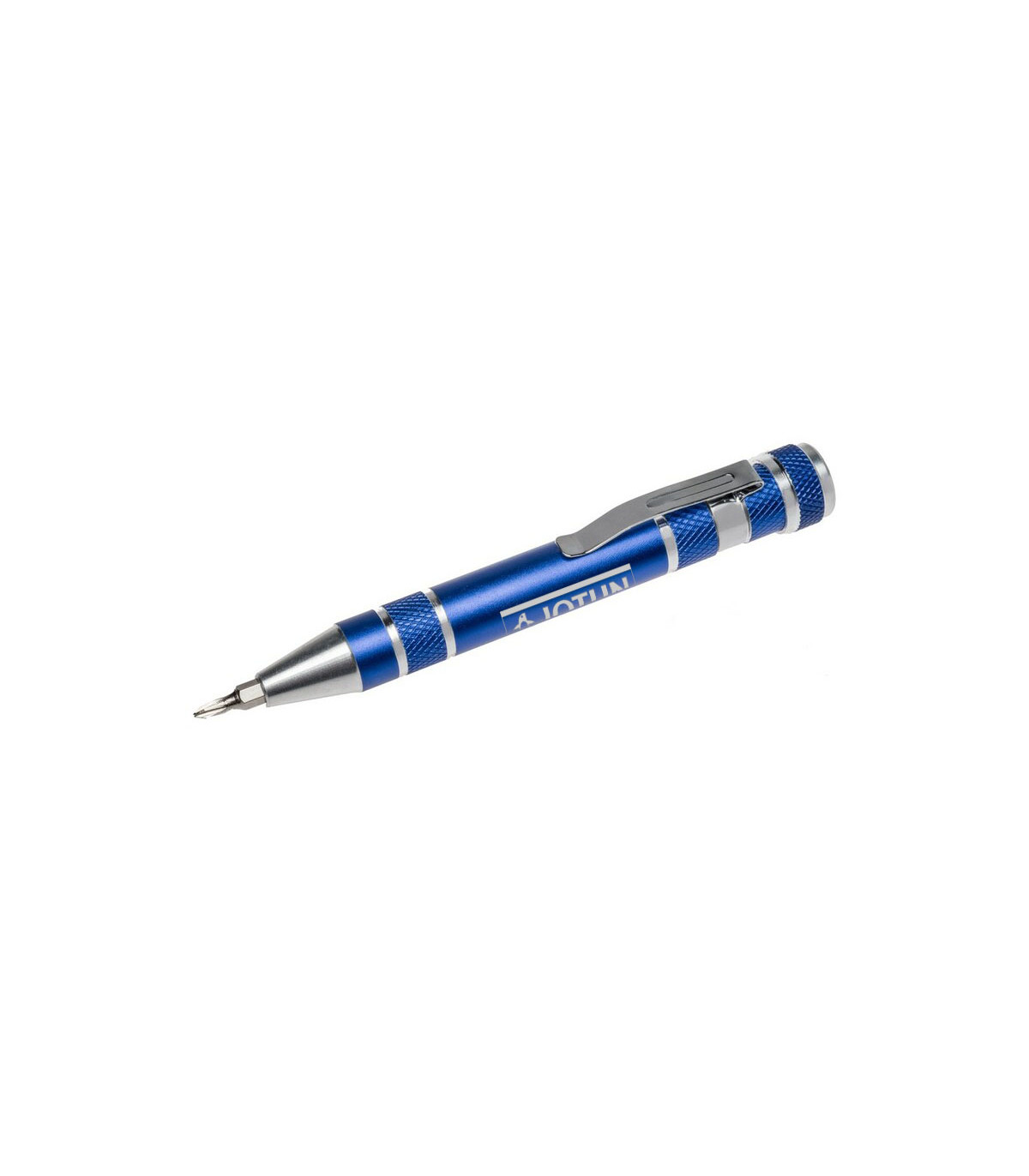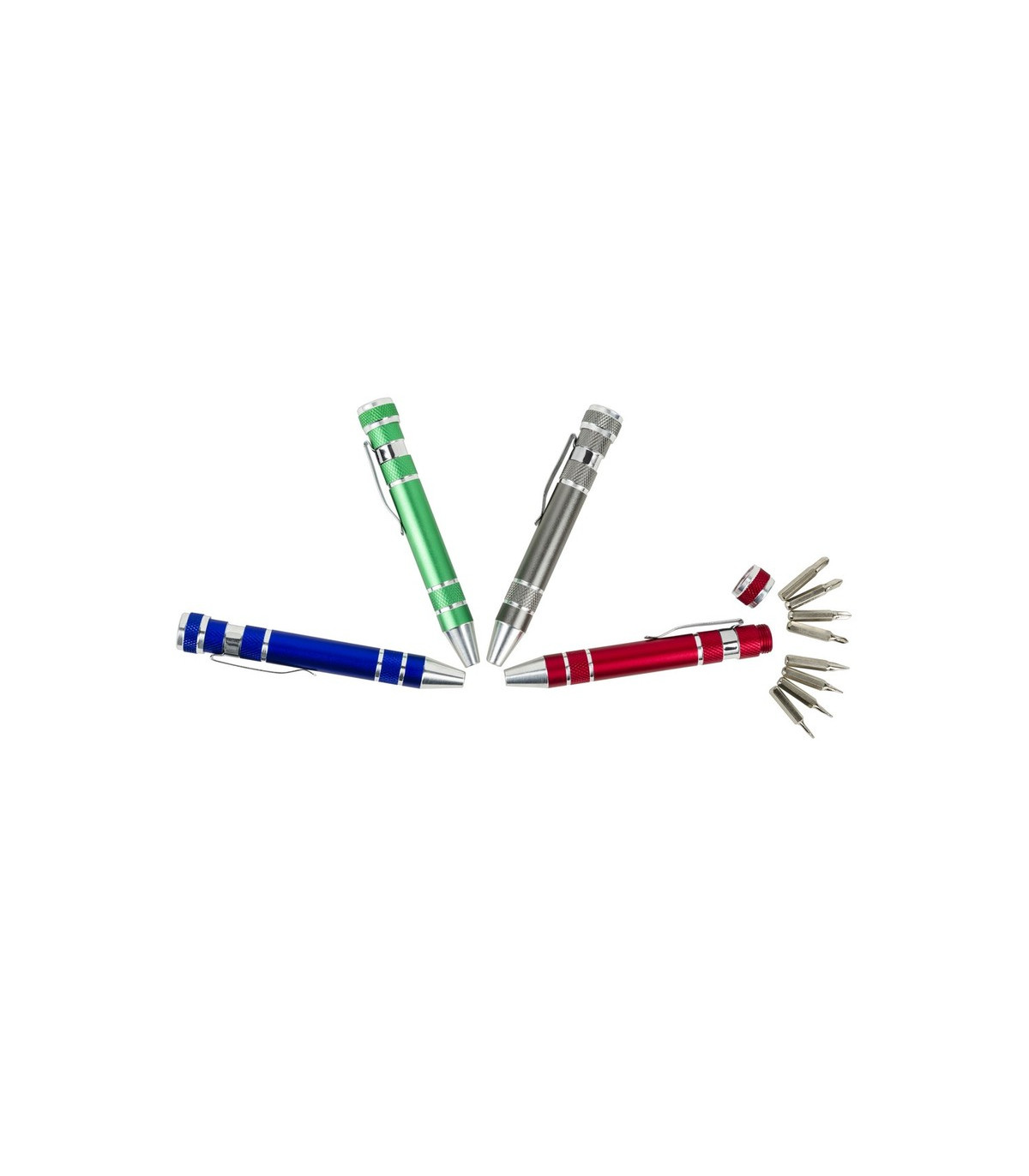 Śrubokręt w kształcie długopisu z 4 płaskimi i 4 krzyżakowymi końcówkami, posiada klip umożliwiający przypinanie, produkt wykonany z aluminium i stali