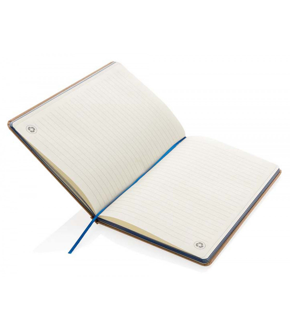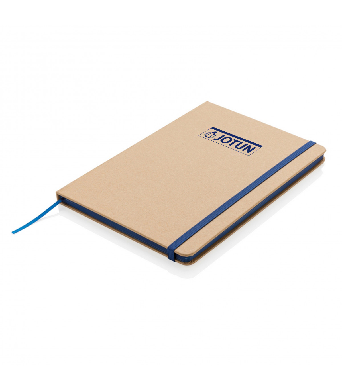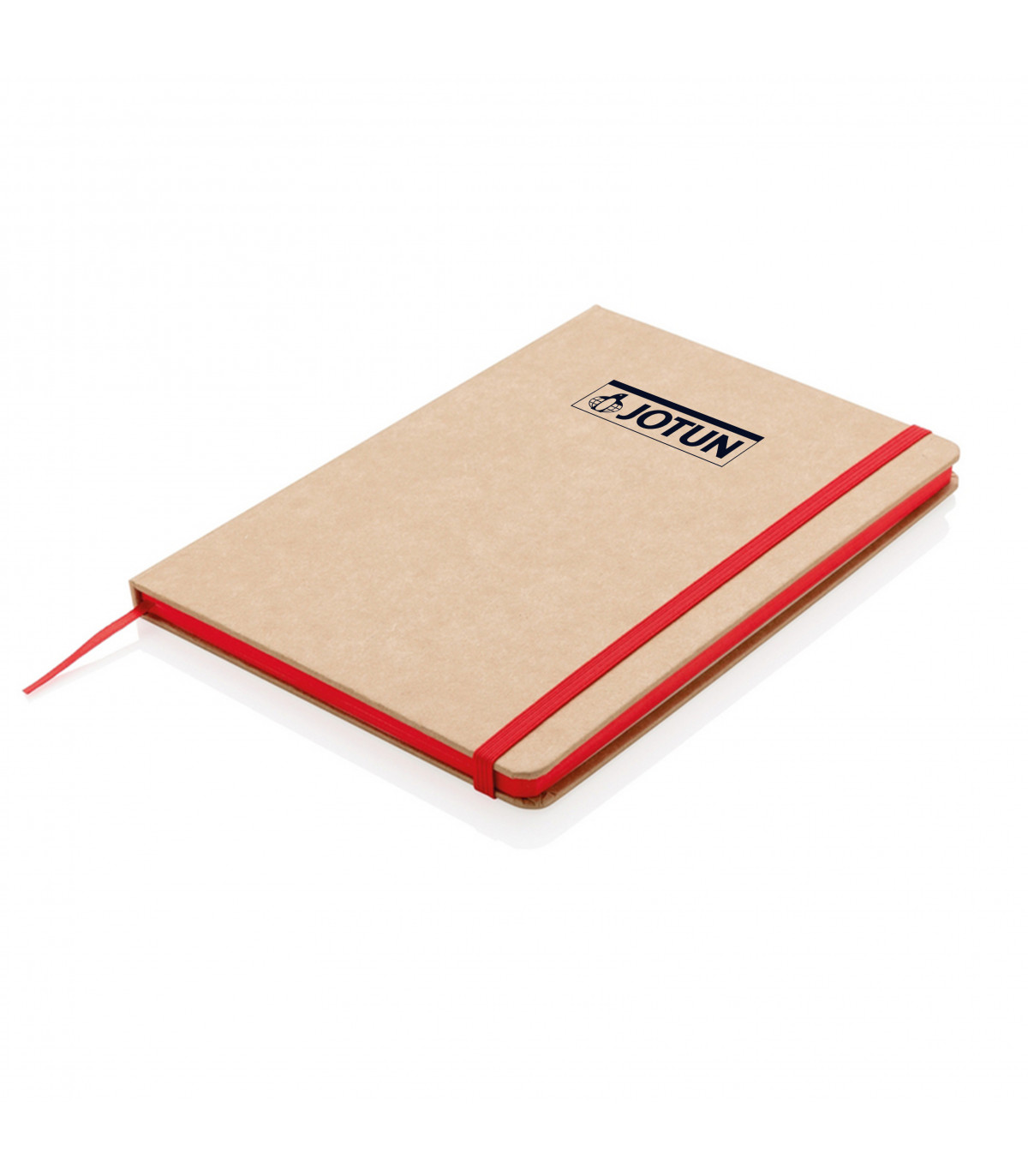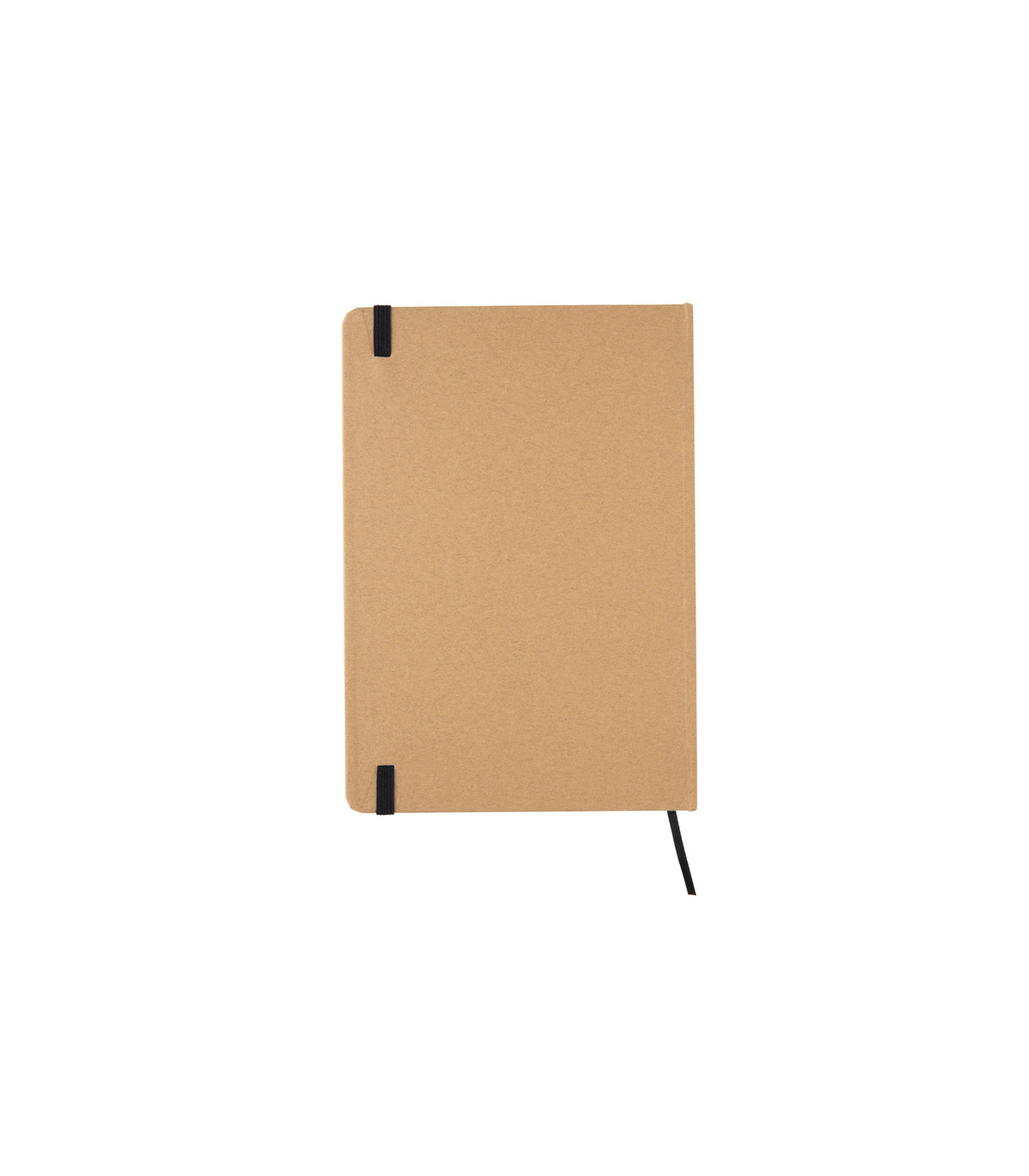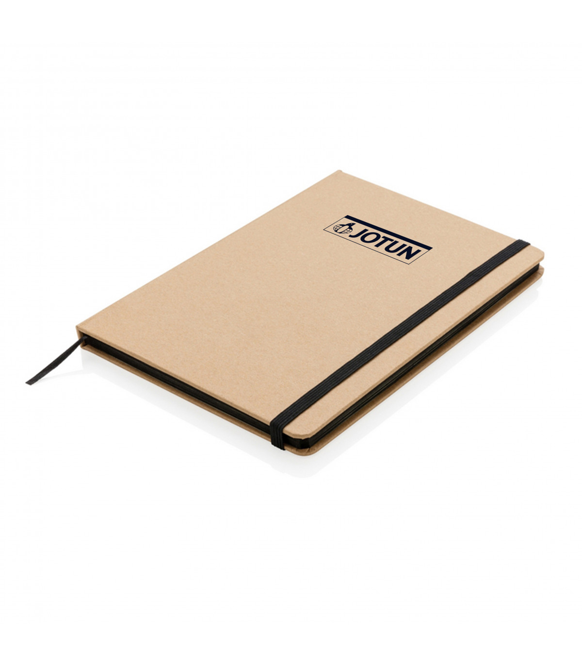 Notatnik A5 (72 kremowe kartki 70 g/m2 w linie), wykonany z papieru makulaturowego, tasiemka zakładkowa i elastyczna opaska do zamykania