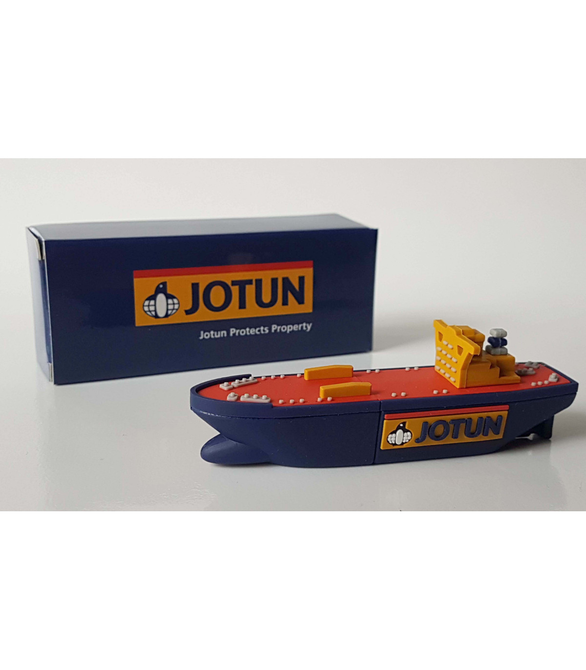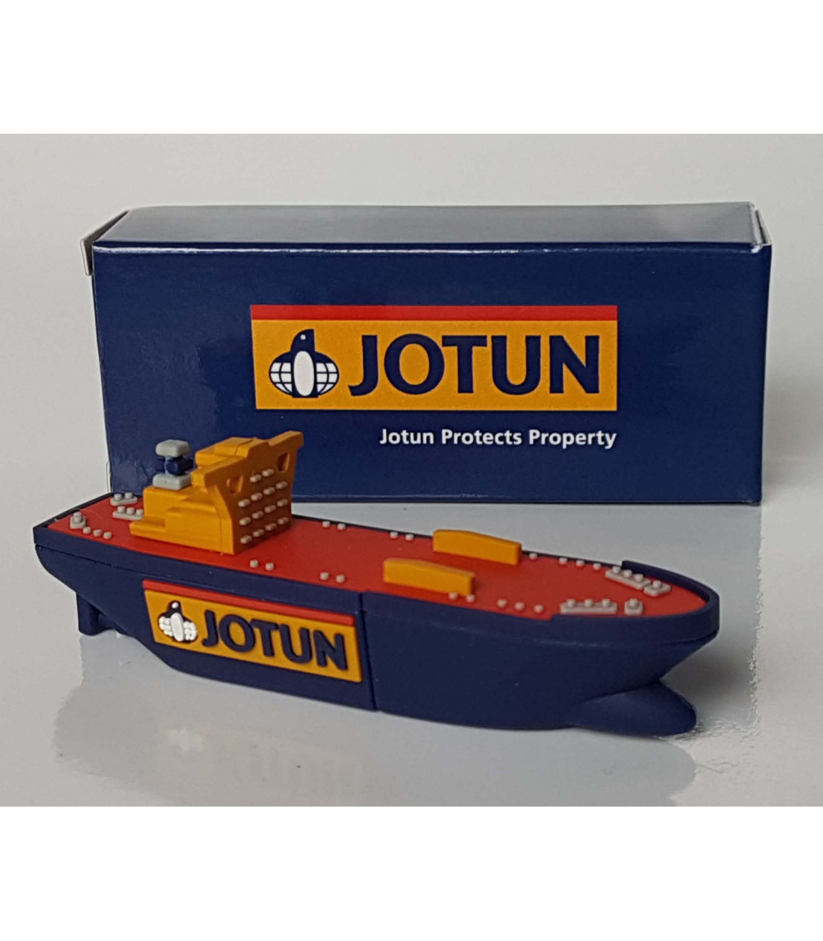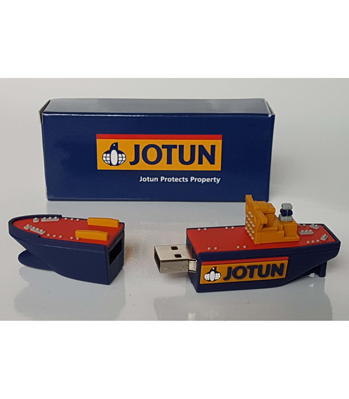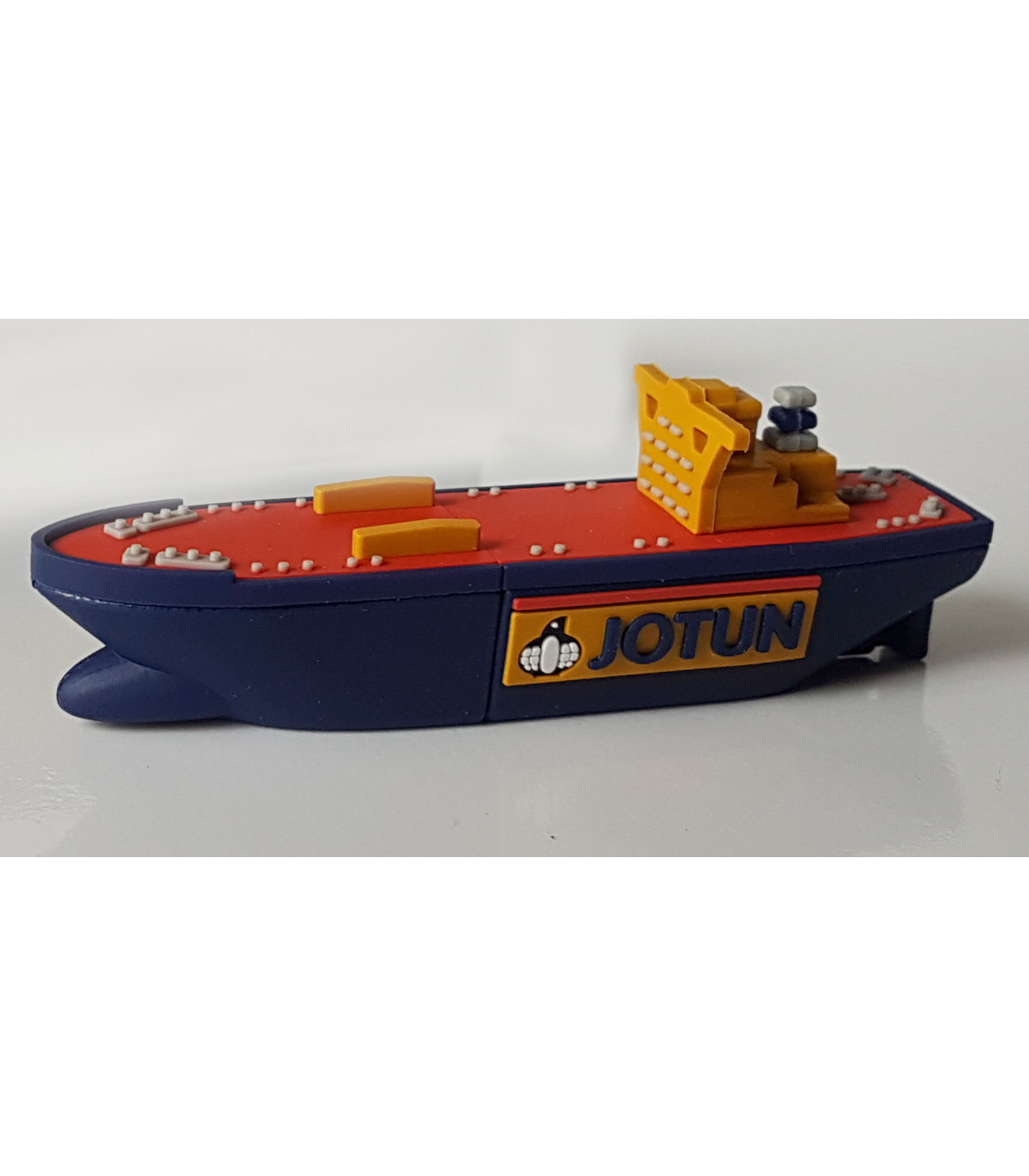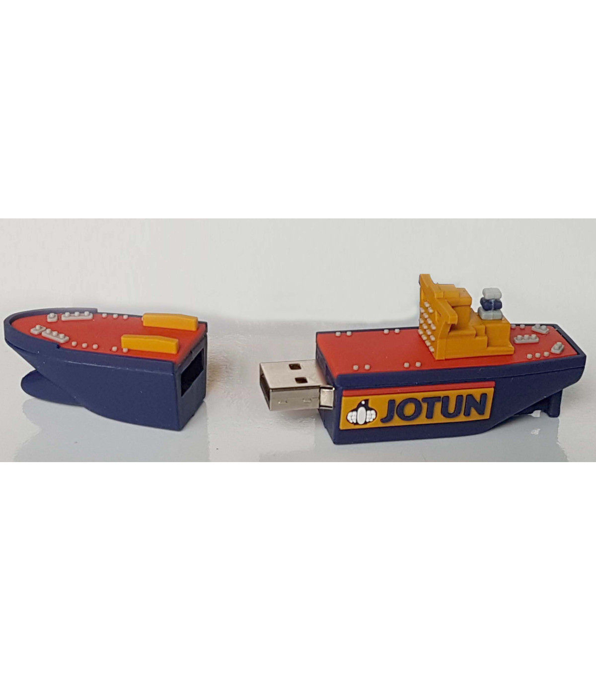 Pamięć USB z miękkiego PCV 3D w kształcie statku. Pamięć pakowana w pudełko kartonowe z indywidualnym zadrukiem z logo.