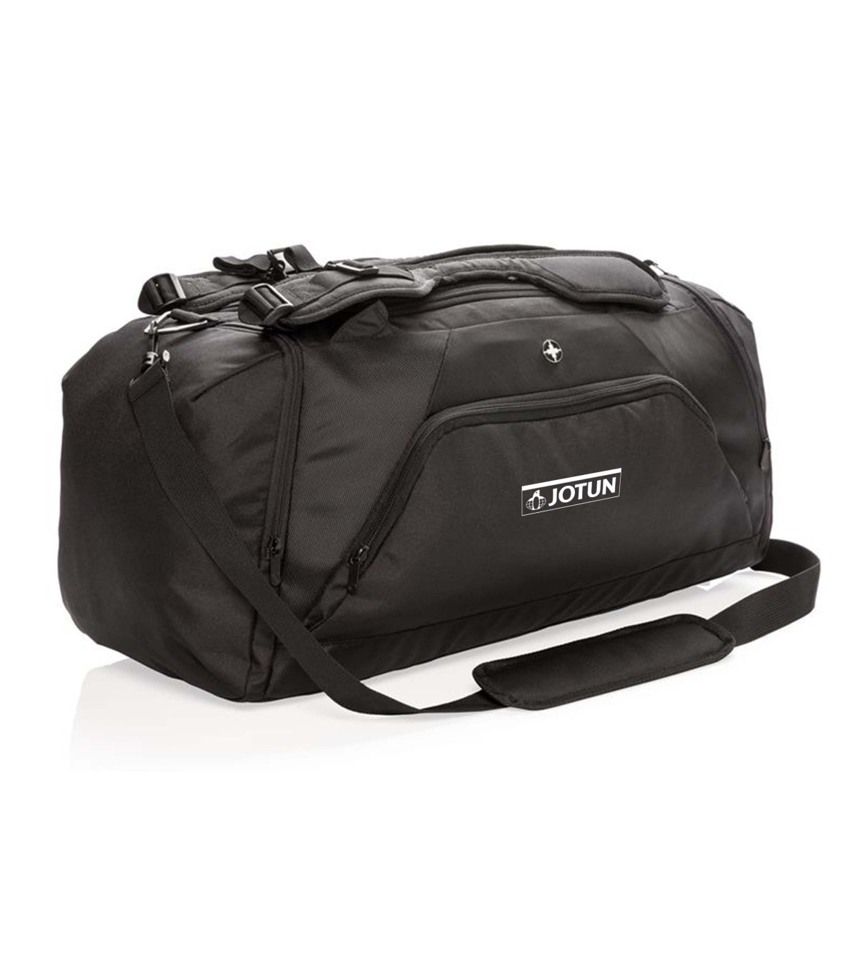 Plecak, torba sportowa, podróżna z ochroną RFID, wykonany z poliestru 1680D i 600D, pojemna przegroda główna z górnym zamknięciem na zamek błyskawiczny w kształcie litery U, boczna przegroda na buty, druga boczna kieszeń na zamek błyskawiczny, z tyłu dodatkowa kieszeń oraz kieszeń szybkiego dostępu, przednia kieszeń na zamek błyskawiczny z ochroną RFID, regulowane paski na ramię, nie zawiera PVC