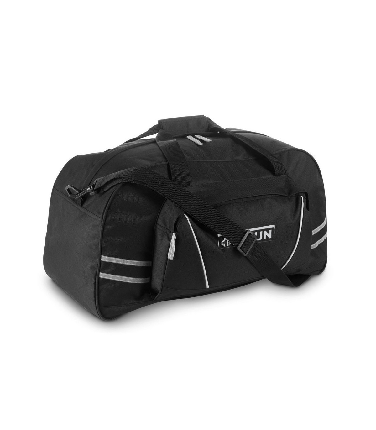 Torba sportowa, podróżna z dużą kieszenią przednią i połyskliwymi paskami, regulowany pasek na ramię