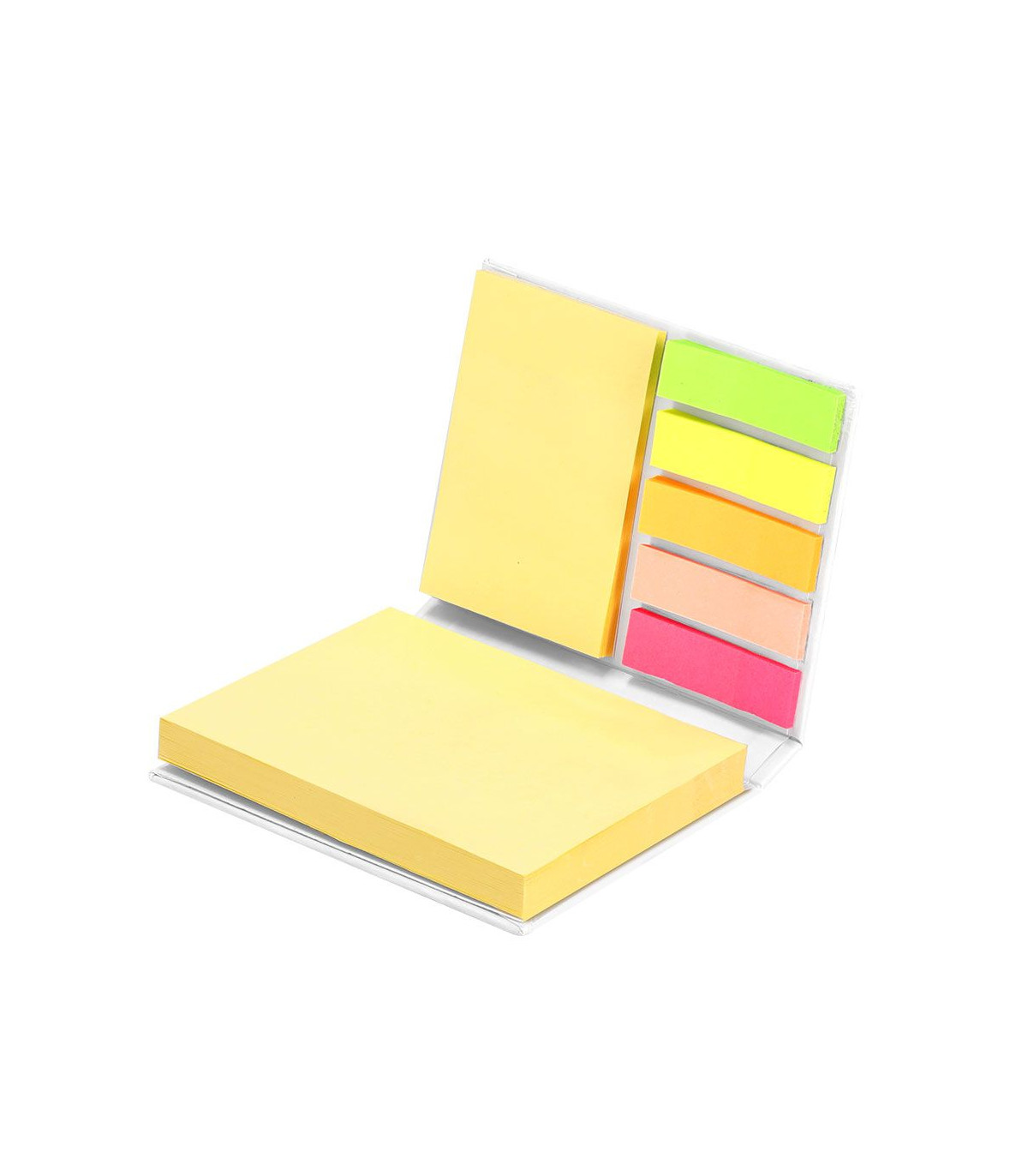 Notatnik z sztywną okładką z tektury pochodzącej z recyklingu, z karteczkami samoprzylepnymi. Zawiera: 50 dużych karteczek samoprzylepnych, 25 średnich karteczek samoprzylepnych i 125 mini karteczek samoprzylepnych w różnych kolorach (fuksja, pomarańczowy, żółty, zielony i różowy).